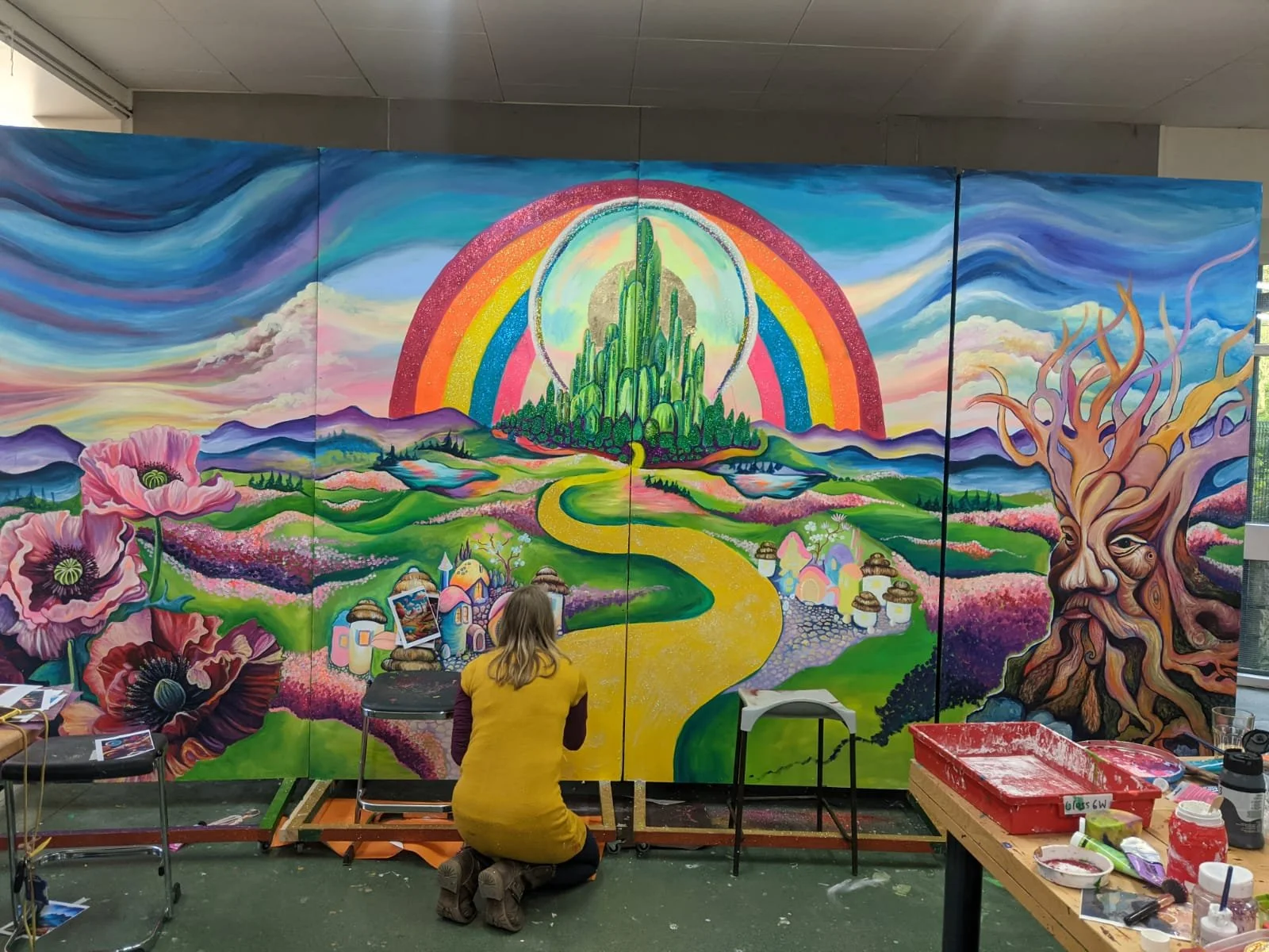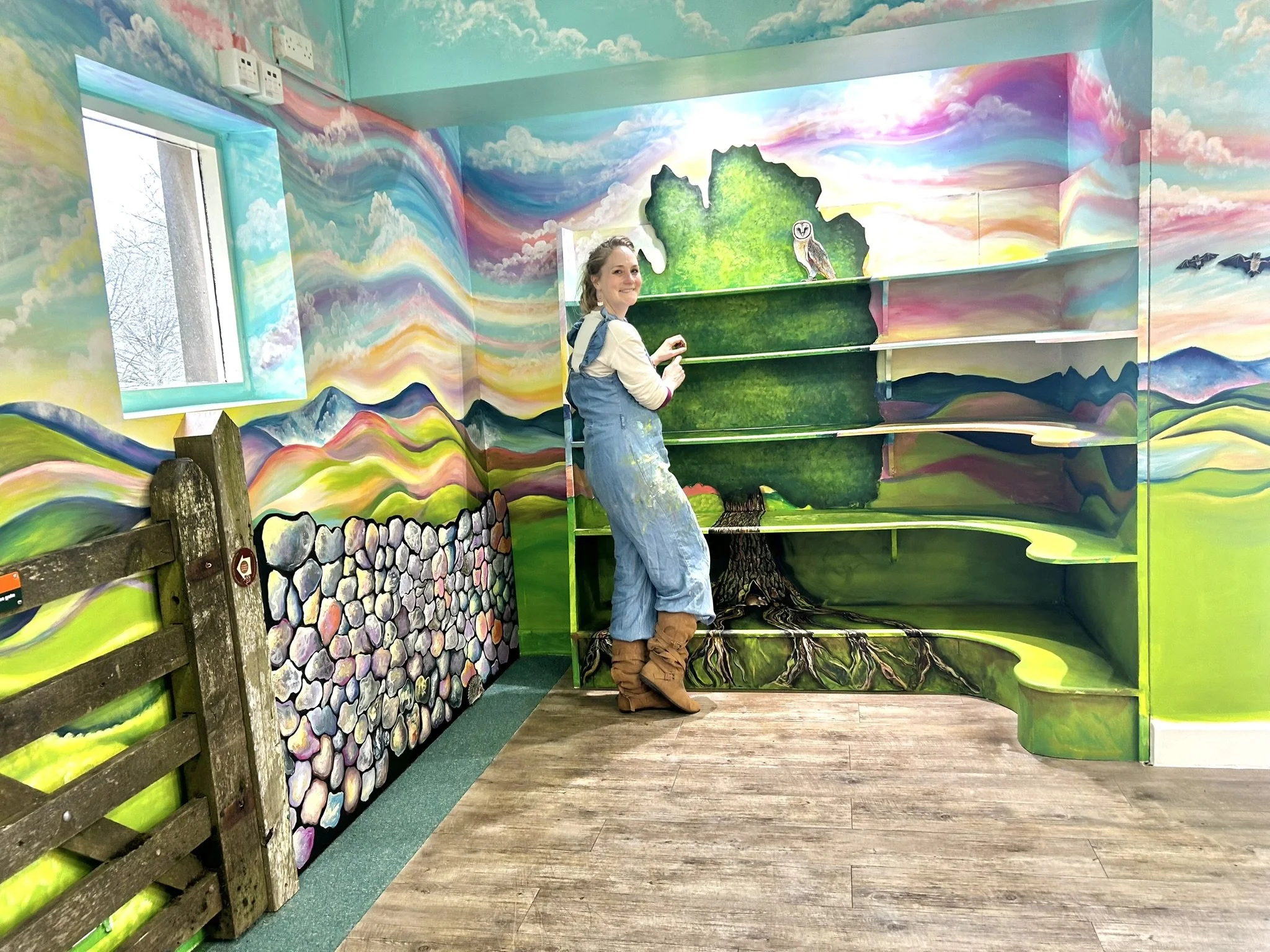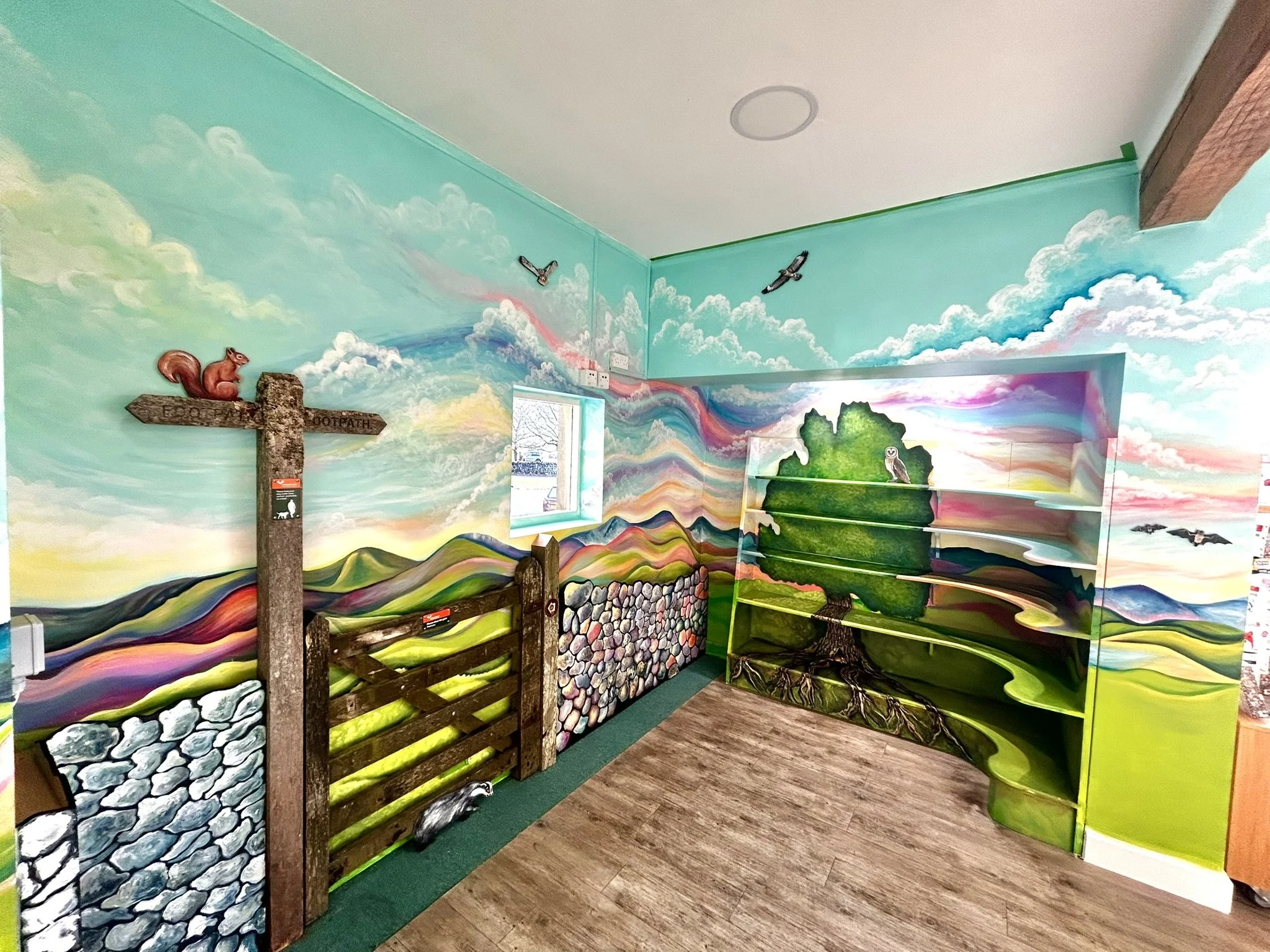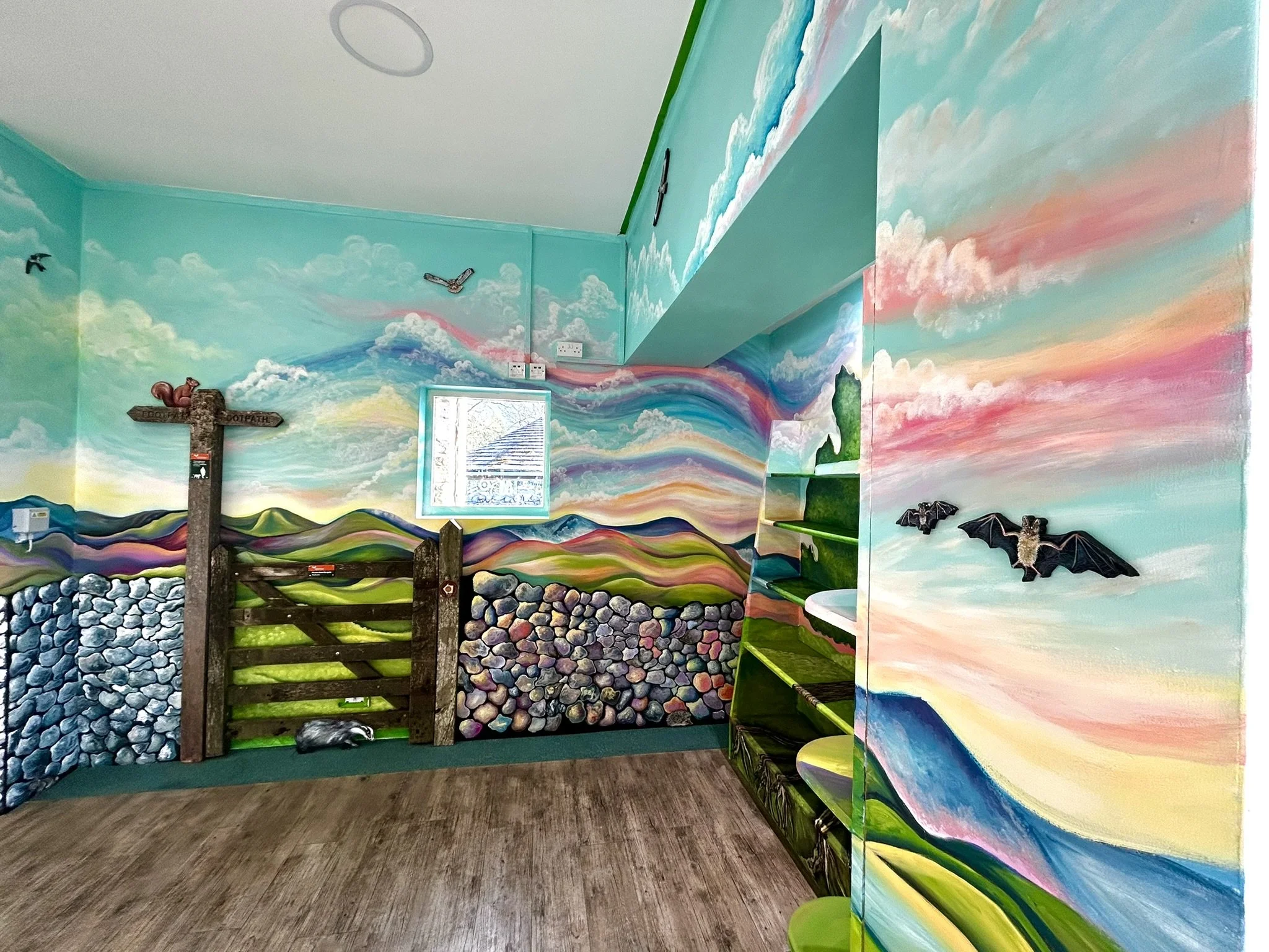 My murals are colourful, layered, story-rich spaces. Whether created for a child’s bedroom, a school corridor, a theatre set or a visitor centre wall, each piece is shaped by its setting and purpose. I work in acrylics and light-relief techniques to create visual impact, often incorporating fluorescent colours, glitter, and gold leaf to add a sense of enchantment. These shimmering materials reflect not only light, but the vibrance and electricity of musical drama, evoking movement, rhythm and emotion. Inspirations vary from the soft hues of the Yorkshire Dales to ancient Egypt, historical narratives and theatrical worlds. I often blend the real with the imagined, mixing rustic found objects with sculpted textures to form poetic storyscapes. Hidden animals or interactive details invite visitors to search, to touch, and to step into a world of curious juxtapositions where scale shifts, stories unravel, and the walls feel sprinkled with sherbet for the fun and lace for the detail. A little Wonderland waiting to be wandered through.