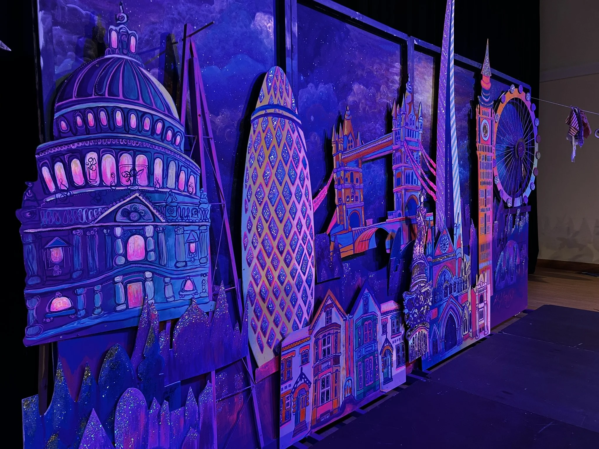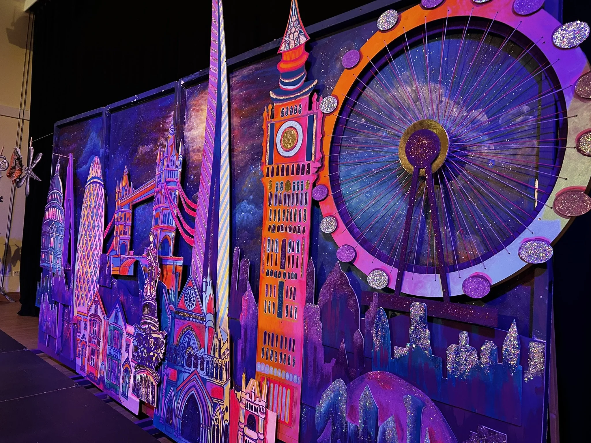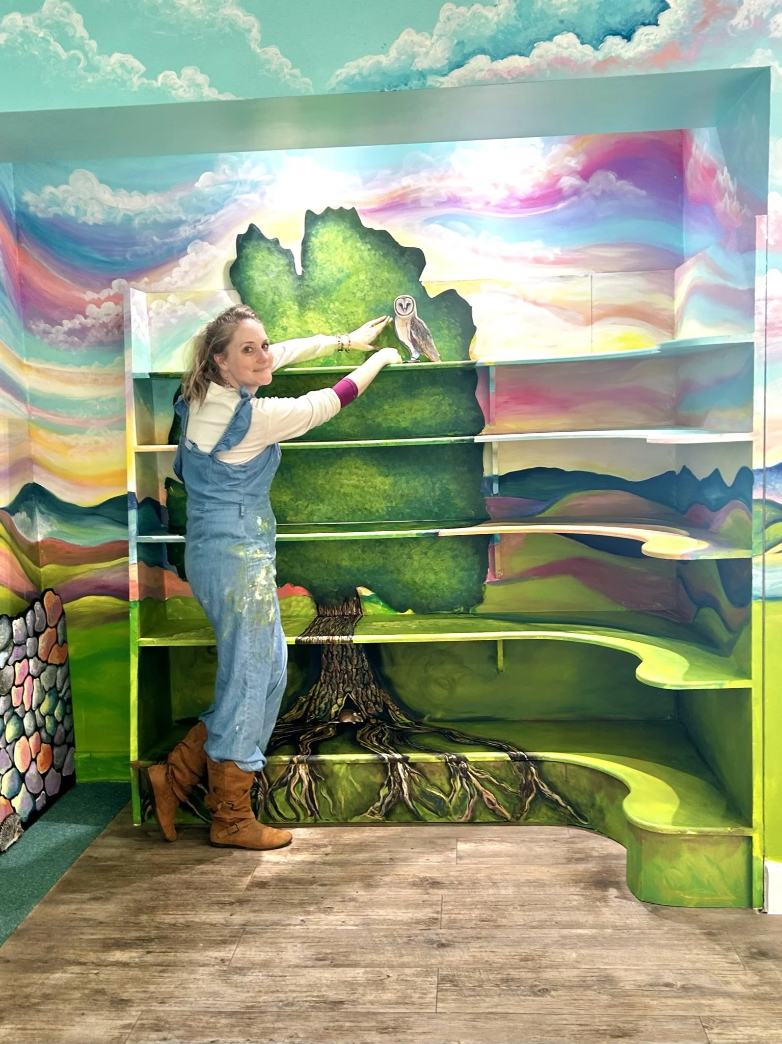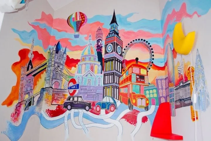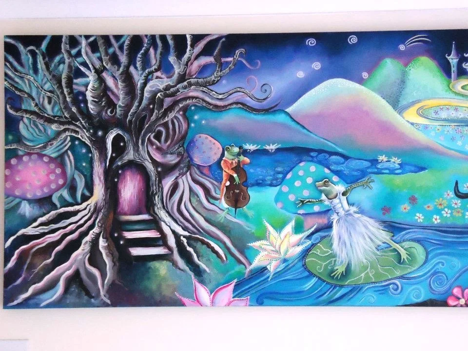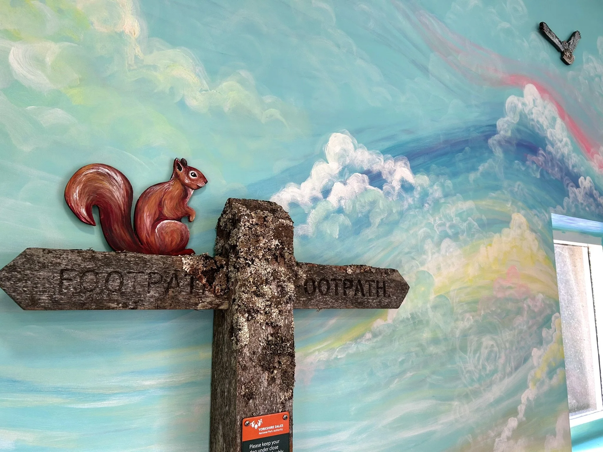 My murals are colourful, layered, story-rich spaces. Whether created for a child’s bedroom, a school corridor, a theatre set or a visitor centre wall, each piece is shaped by its setting and purpose. I work in acrylics and light-relief techniques to create visual impact, often incorporating fluorescent colours, glitter, and gold leaf to add a sense of enchantment. These shimmering materials reflect not only light, but the vibrance and electricity of musical drama, evoking movement, rhythm and emotion. Inspirations vary from the soft hues of the Yorkshire Dales to ancient Egypt, historical narratives and theatrical worlds. I often blend the real with the imagined, mixing rustic found objects with sculpted textures to form poetic storyscapes. Hidden animals or interactive details invite visitors to search, to touch, and to step into a world of curious juxtapositions where scale shifts, stories unravel, and the walls feel sprinkled with sherbet for the fun and lace for the detail. A little Wonderland waiting to be wandered through.